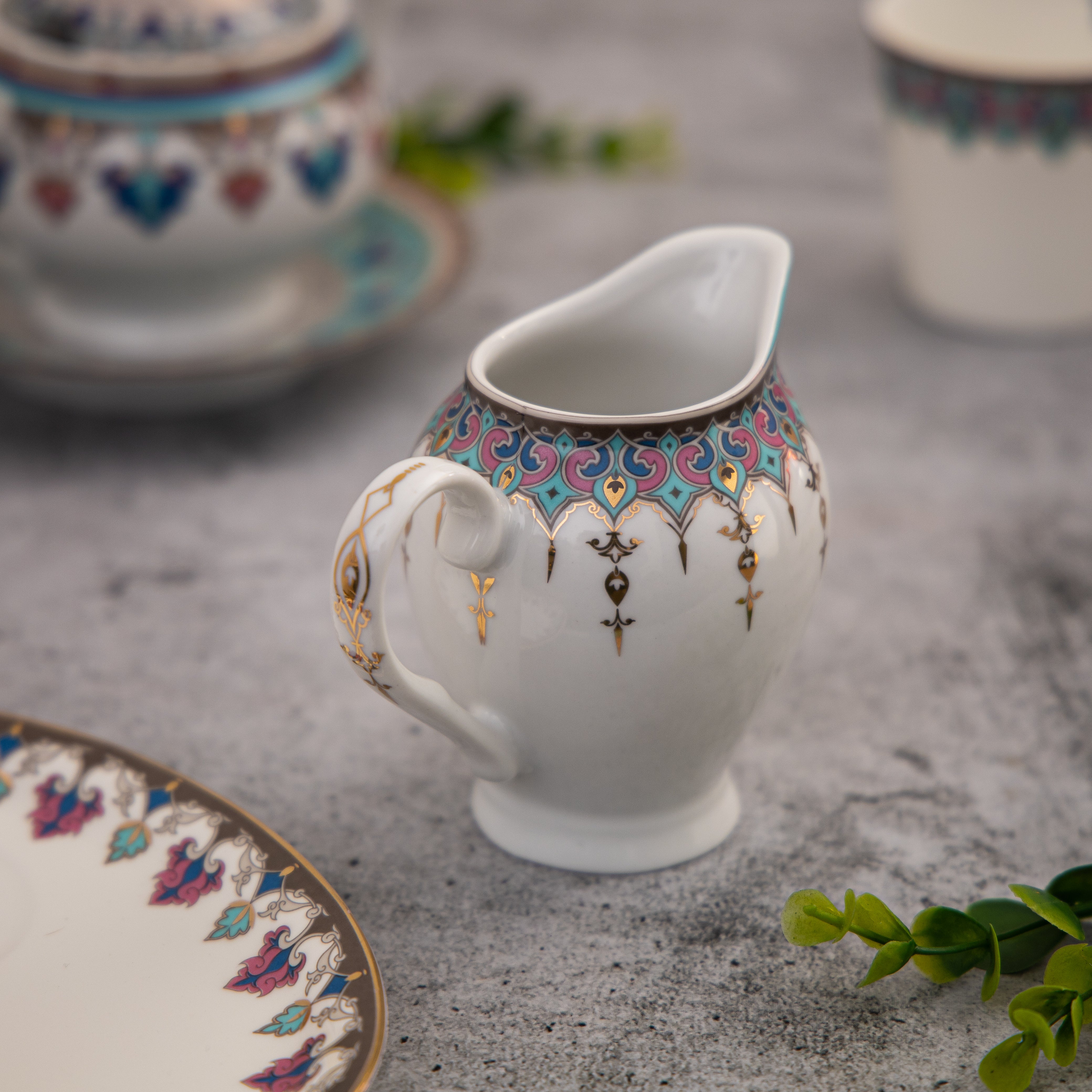 A vibrant porcelain tea-set inspired by the social and colourful nature of a parrot. Intricately crafted from fine porcelain and adorned with 24-carat gold detailing, this set is a tribute to enduring craftsmanship that can become a detailing, this set is a tribute to enduring craftsmanship that can become a cherished heirloom. It includes a tea-pot to pour your brews, a milk pot for serving warm or cold milk, and a sugar pot for sweeteners for your beverages. Elevate your everyday tea ritual or a grand high-tea experience with our beautiful Noor Tea Set. This set is also a great gifting option for your loved ones with refined tastes.