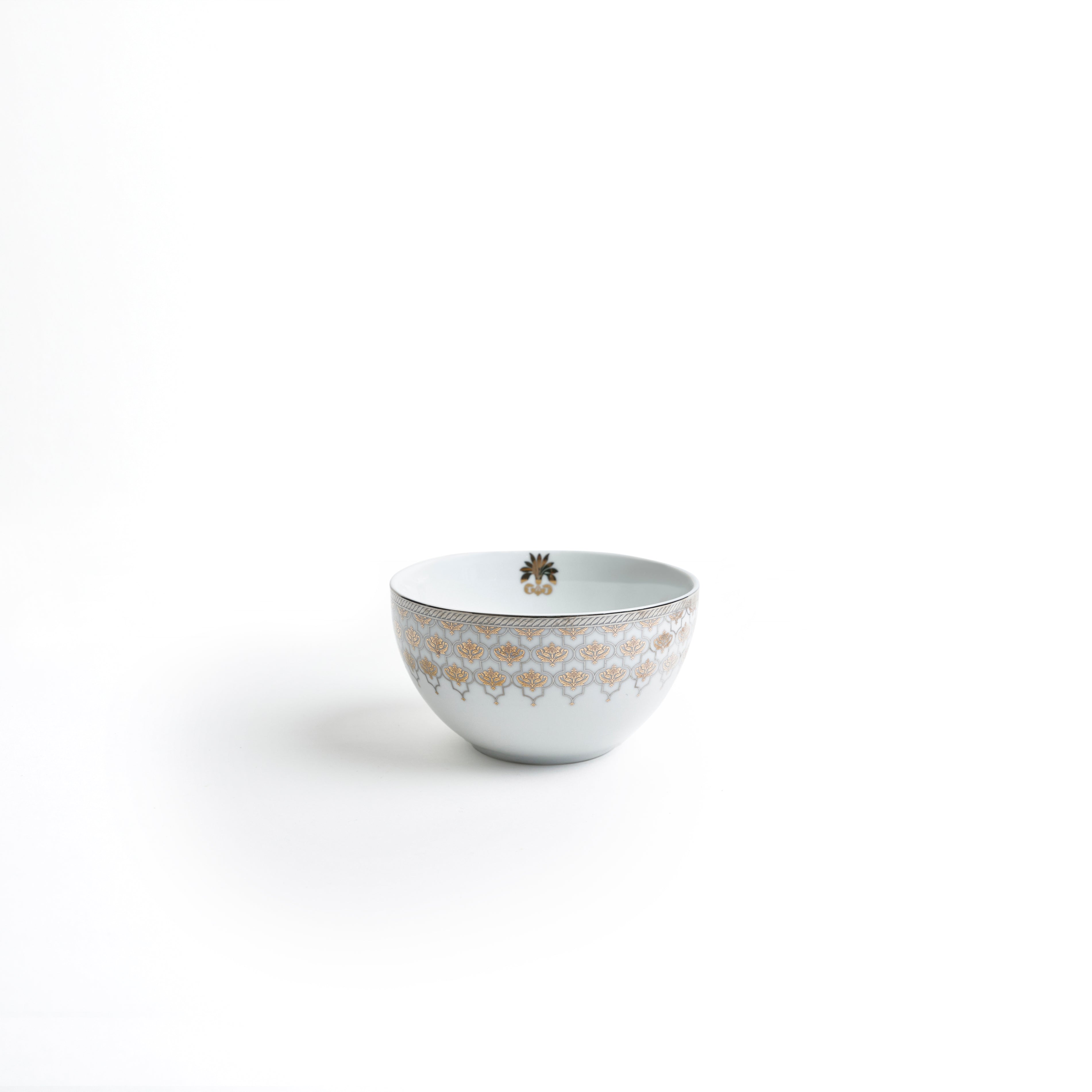 Set of six 4.5" deep porcelain bowls, showcasing intricate gold detailing and platinum lining - perfectly complementing each other to transfer every meal into a royal experience. These bowls are perfect soup bowls that can also be used for serving stews and broths, adding a touch of warmth and elegance to every meal.