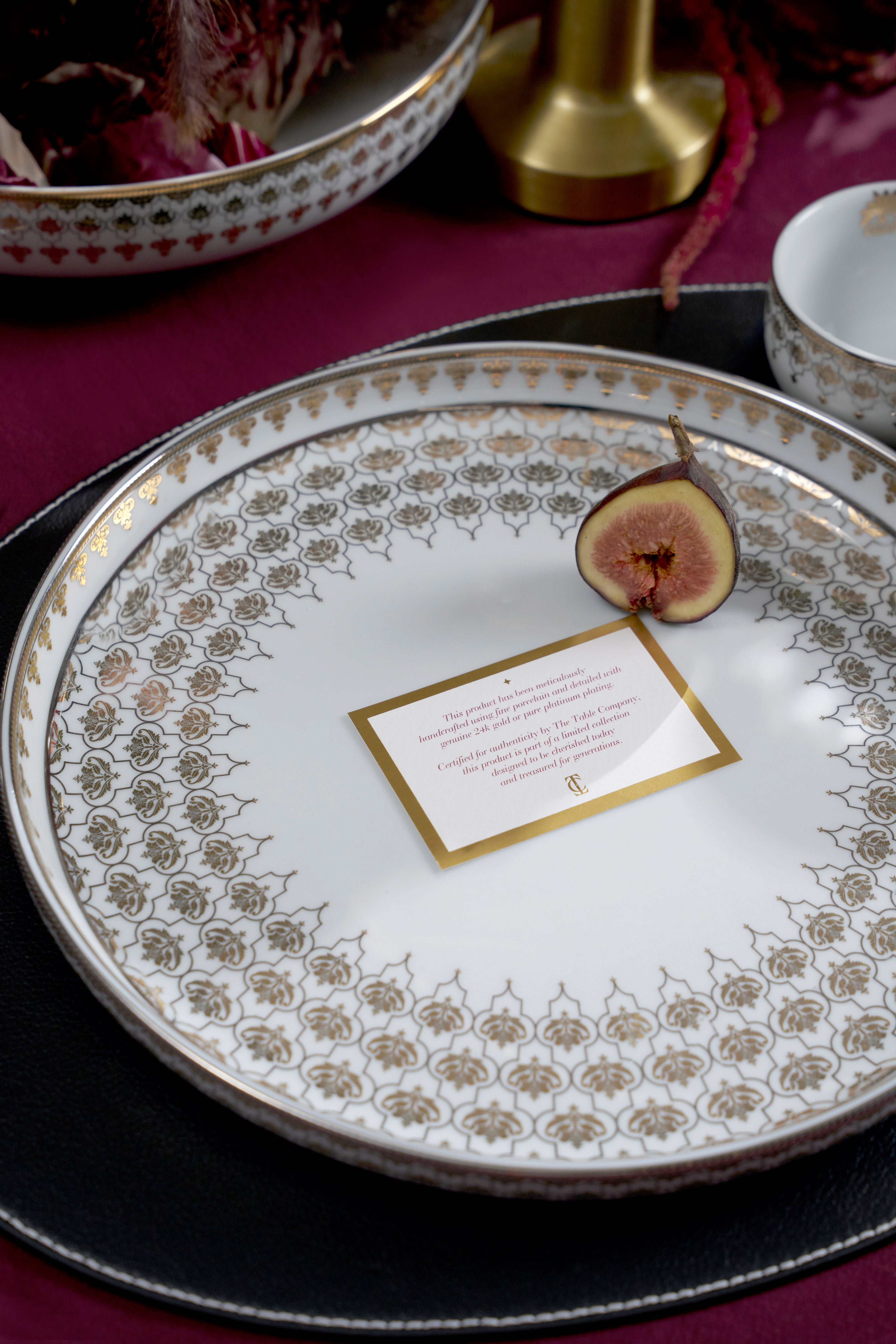 Set of six 10.5” porcelain thali plates, showcasing intricate gold detailing and platinum lining - perfectly complementing each other to transfer every meal into a royal experience. Designed with keeping timeless sophistication and quiet grandeur in mind, these plates are collectibles for those who appreciate art and indulge in grand hosting.