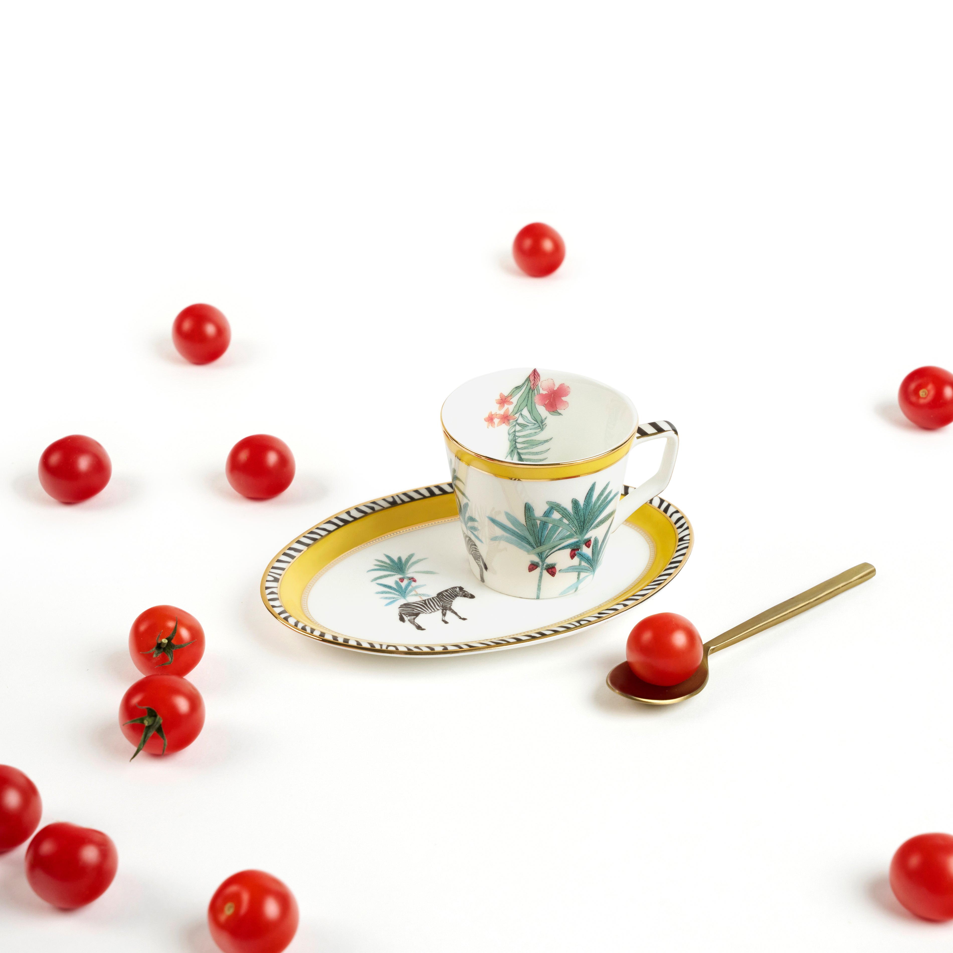 Set of 6 oval saucers paired with 6 cups, made of fine-china and intricately handcrafted with a gold-plated chic design—blending contemporary elegance with artisanal craftsmanship for serving hot beverages like tea or coffee in style. The cup holds the drink, while the oval saucer provides space not only to rest the cup but also to hold a small treat like a cookie, biscuit, or sugar cube. This combination is perfect for both everyday use and formal settings, adding style and functionality. This set also qualifies as a beautiful and thoughtful gifting option for your loved ones.
