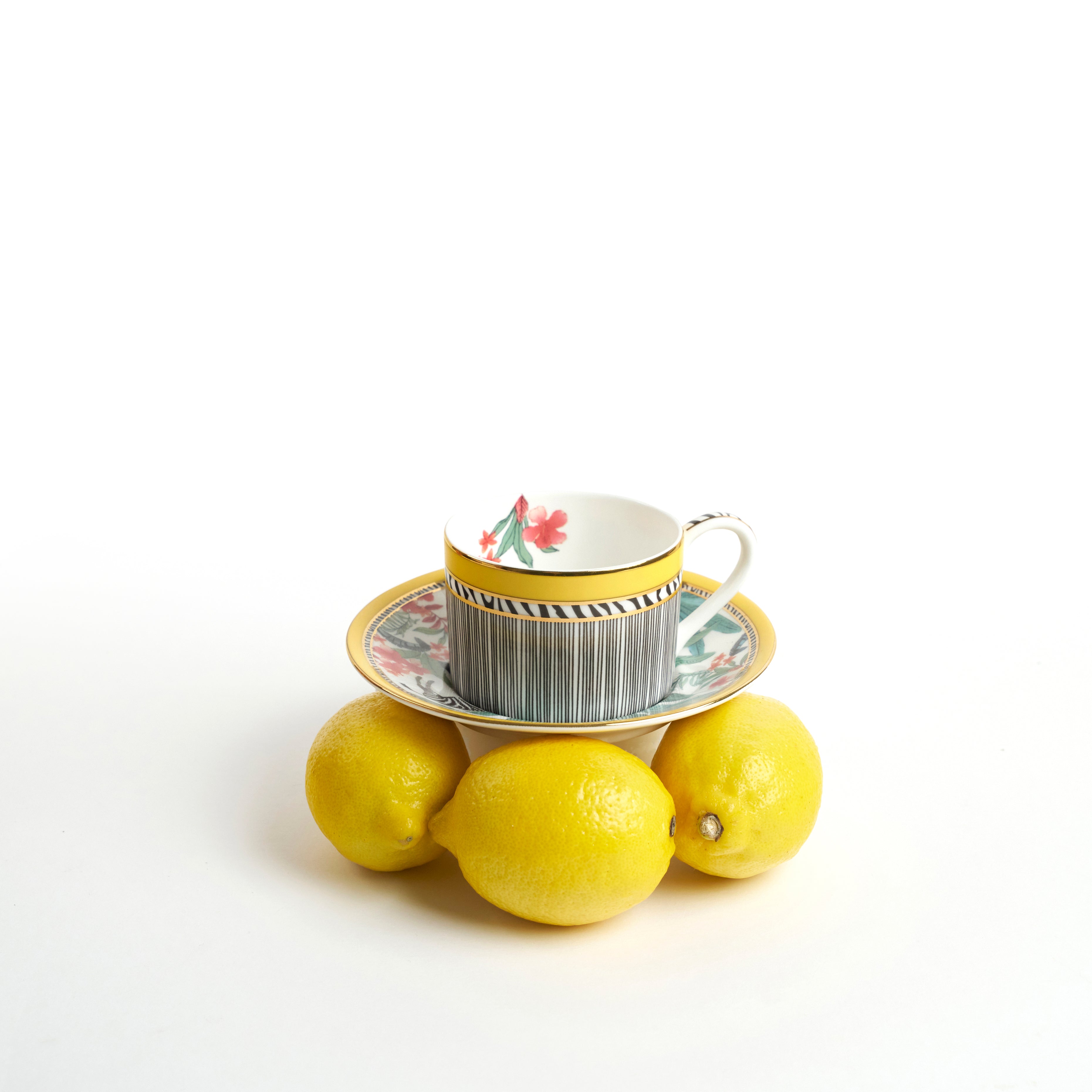 Set of 6 round saucers paired with 6 cups, made of fine-china and intricately handcrafted with a gold-plated chic design—blending contemporary elegance with artisanal craftsmanship for serving hot beverages like tea, coffee or herbal infusions. The cup provides a comfortable and stylish vessel for sipping, while the saucer catches drips, protects surfaces, and offers space for a spoon or a small treat. Ideal for everyday use, high tea, or formal gatherings, this classic set enhances the presentation and enjoyment of your beverage. This set is a beautiful gifting option for your loved ones.