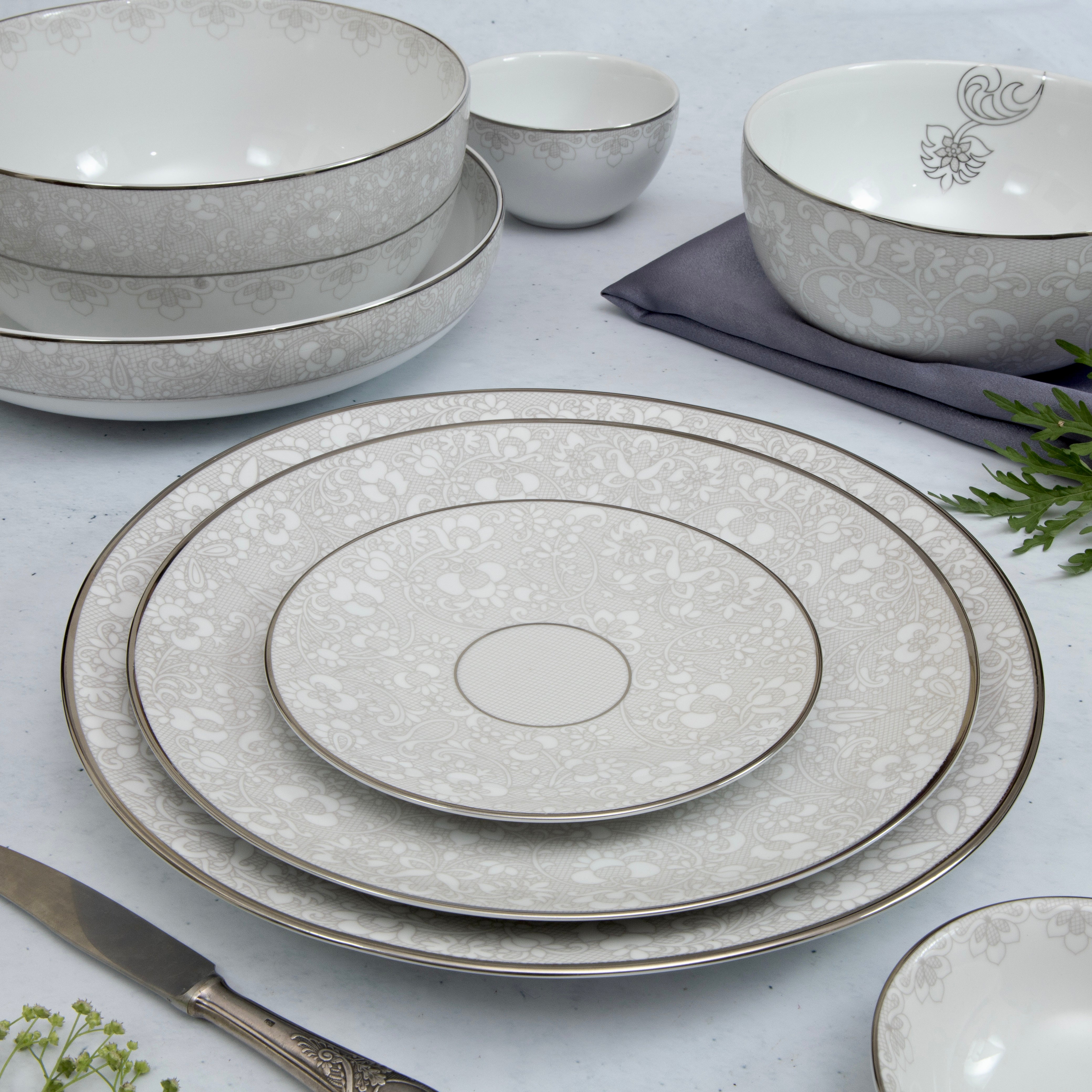 Set of six 7" inspired by 17th-century French bobbin lace with platinum detailing. The intricate lacework patterns, delicately rendered on fine porcelain, speak of refined elegance and craftsmanship. These plates can used as a perfect starter plate, side plate and for serving desserts
