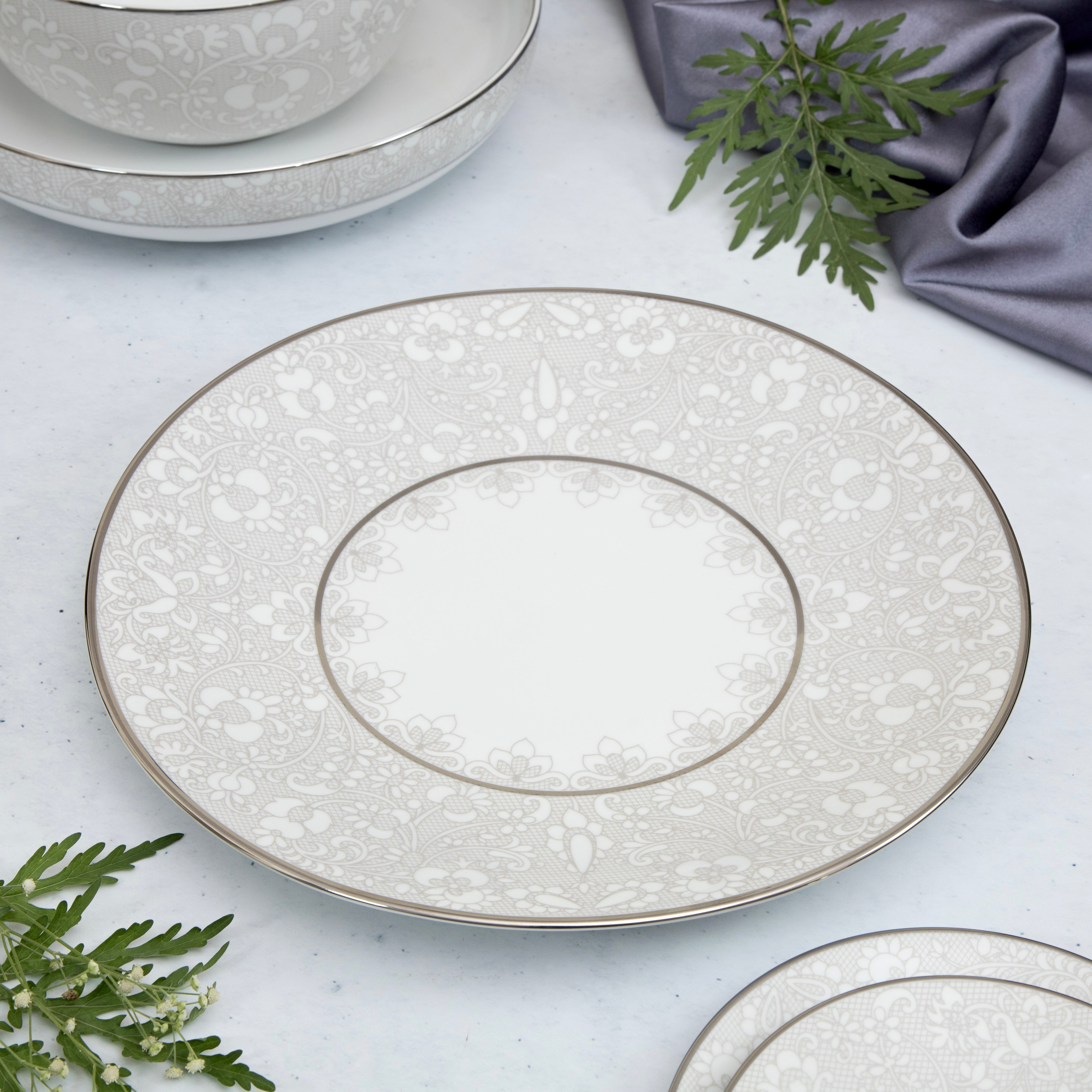 A 12" round platter inspired by 17thcentury French bobbin lace with platinum detailing. The intricate lacework patterns, delicately rendered on fine porcelain, speak of refined elegance and craftsmanship. This large platter can be used to serve and present main courses, shared appetizers and salads, or assorted desserts, making it ideal for family-style meals, festive gatherings, or elegant table settings.