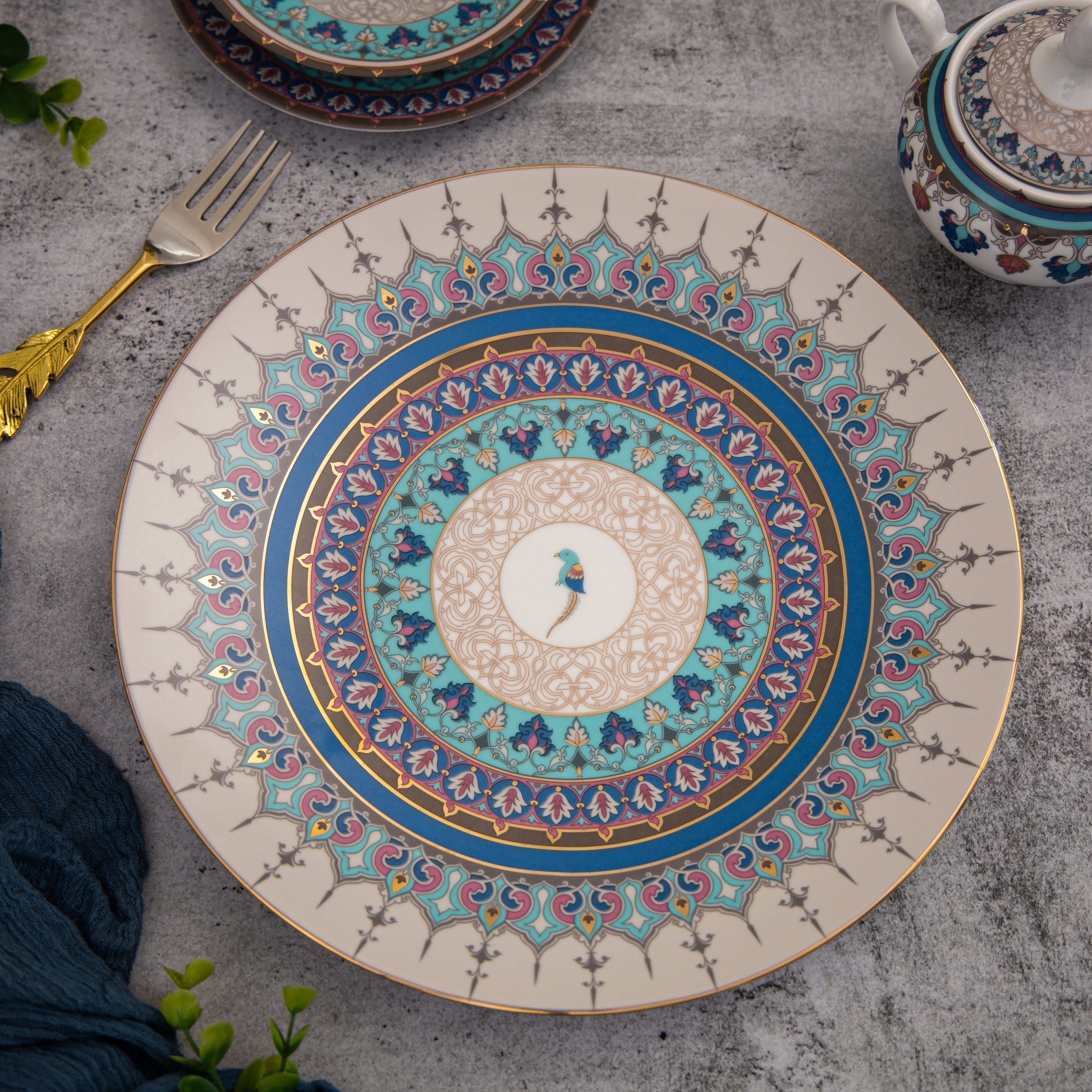 The vibrant Jamawar Dinner Set of 29 handcrafted pieces is inspired by the social and colourful nature of a parrot. Intricately crafted from fine porcelain and adorned with 24-carat gold detailing, each piece of this collection is a tribute to enduring craftsmanship. The Jamawar pattern, steeped in cultural richness, is designed not only to elevate your table but to become a cherished heirloom — passed down through generations.