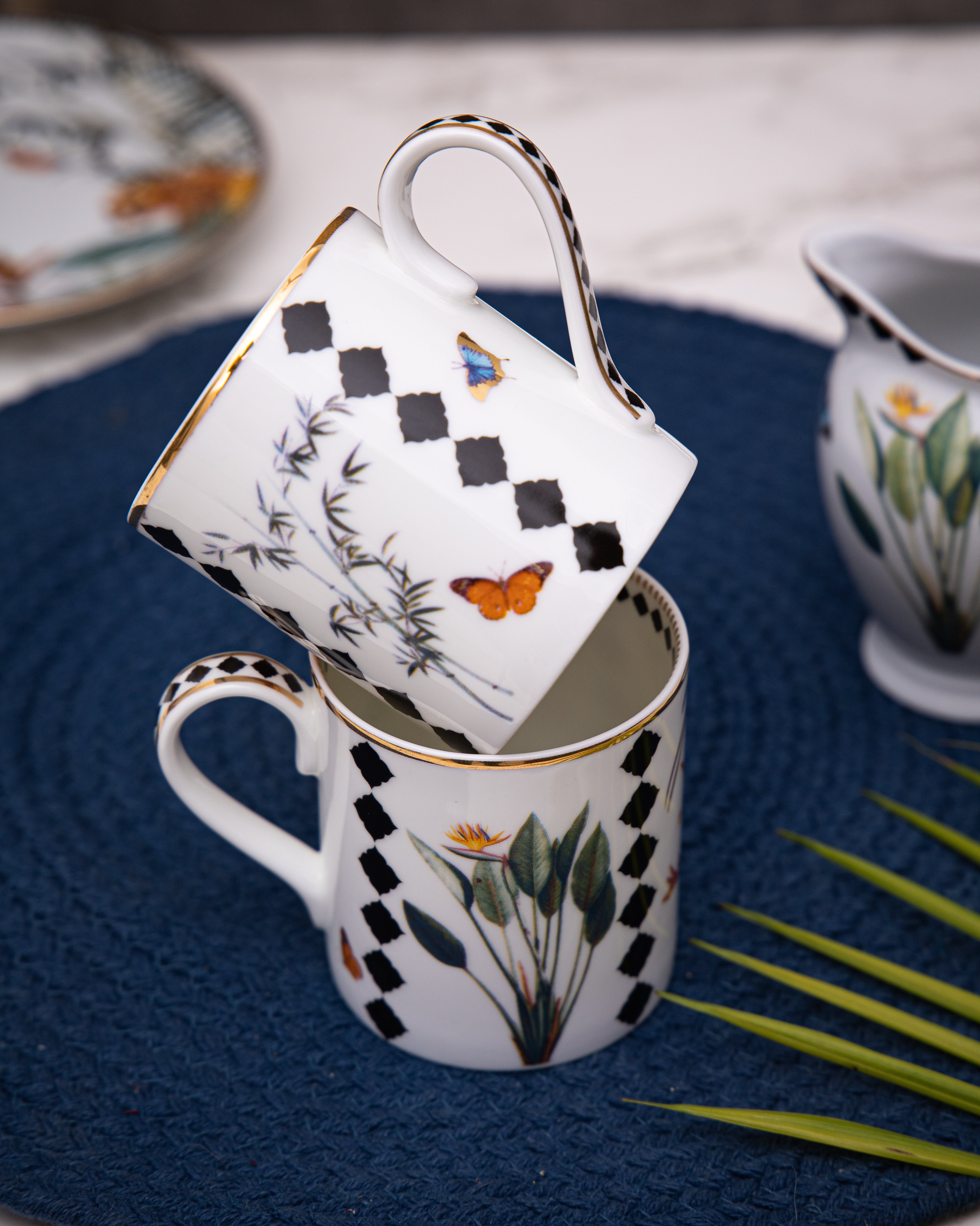 Set of two coffee mugs, intricately handcrafted with a gold-plated tropical design, blending elegance with artisanal craftsmanship. Perfect for serving hot beverages like coffee, tea, hot chocolate, or lattes. Combining design with functionality, each mug features a sturdy handle for a comfortable grip—ideal for everyday use, high tea, or formal gatherings. A stylish and thoughtful gifting option for special occasions.