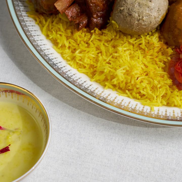 A large 14" fine-china oval platter with hand-detailed lily motifs in soft pinks and whites, floating atop a cool blue base inspired by the waterlily’s in the serene Dal Lake of Kashmir. The Gold accents mimic the shimmer of sunlight on still waters. Designed for elegantly serving large portions of rice, biryani, or pilaf, making it ideal for family meals, festive occasions, or buffet-style dining. Its elongated shape allows for spacious presentation, making it equally suitable for showcasing grilled meats, roasted vegetables, or assorted appetizers alongside rice dishes.